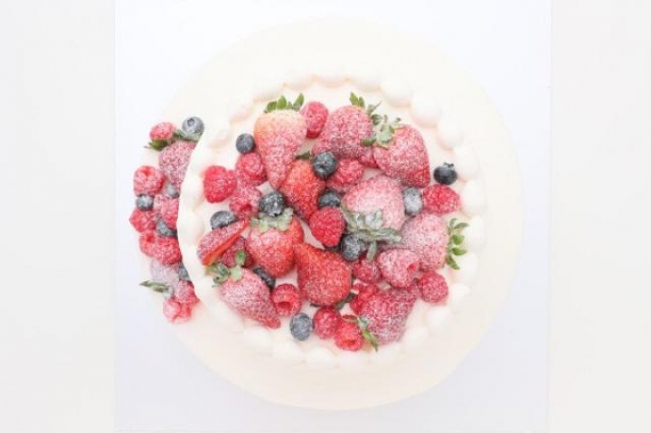 卵、小麦粉、生クリーム、グラニュー糖、ホワイトチョコレート、ゲル化剤、ミロワールヌートル、イチゴ、ラズベリー、ブルーベリー